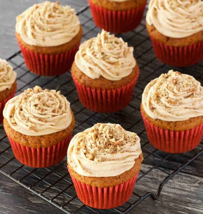 Topped with a pumpkin spice frosting, pumpkin pie spice, and crushed pecans! Anyone else drooling?