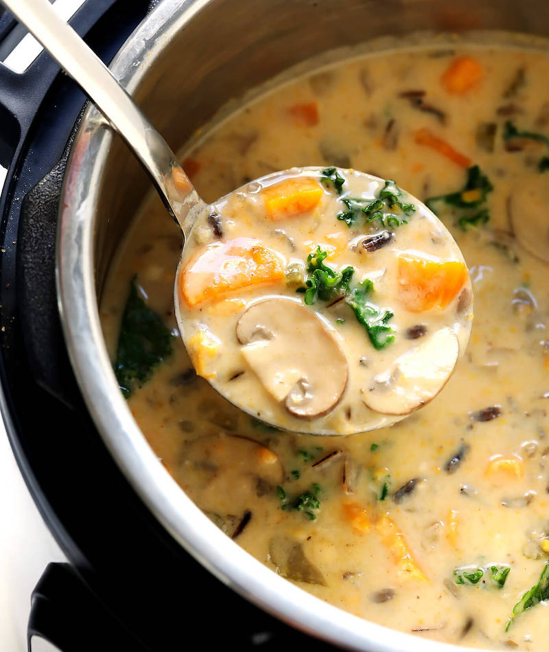This soup is made with fresh seasonal vegetables and greens, wild rice, and a zesty but creamy broth. Swap out the cream for coconut milk to make this recipe completely vegan!